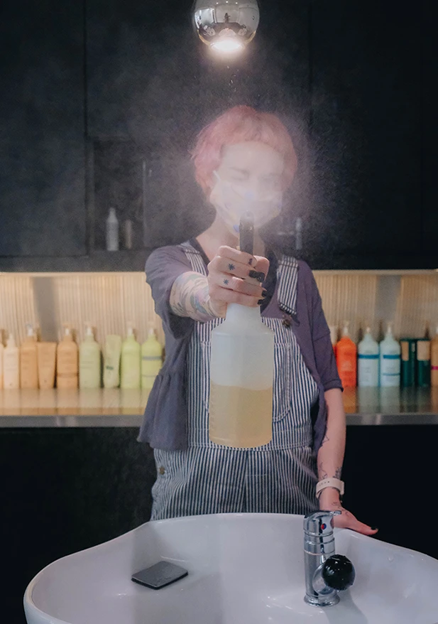 Dulay’s team also continues to mask up during the guest’s shampoo, while they are in close contact.